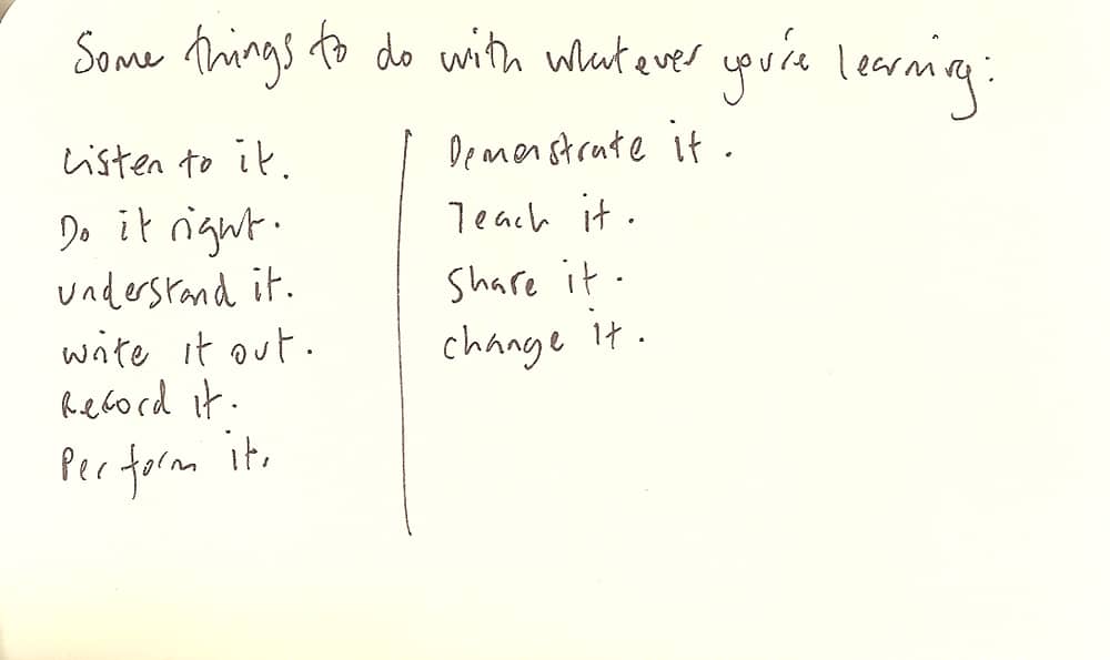 So the idea is to give yourself different ways to learn something. You may find if you try to, for example, demonstrate something you don’t understand, or don’t think you understand, then you may well find yourself getting a different perception of it from explaining it to someone. Even if you understand something, you may get a new angle on it from trying something different with it. You may even change your idea of what ‘understanding’ is.
